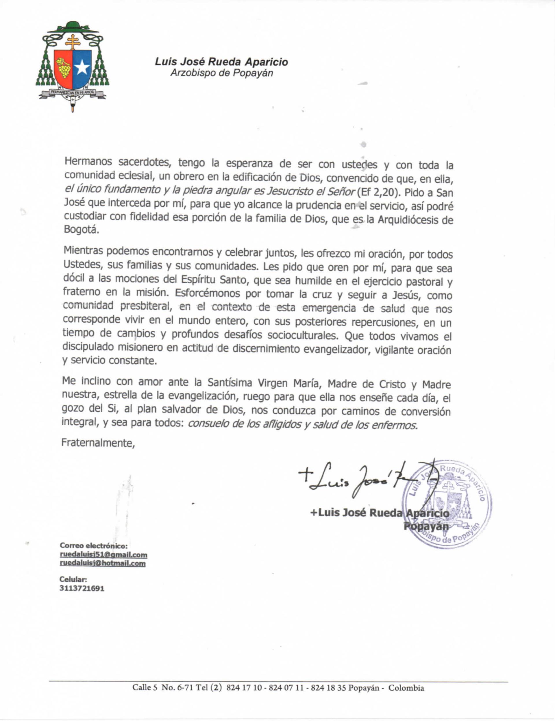 A continuación, texto completo de la carta que monseñor Luis José Rueda Aparicio dirigió al clero arquidiocesano en su nombramiento como nuevo arzobispo de la arquidiócesis de Bogotá: