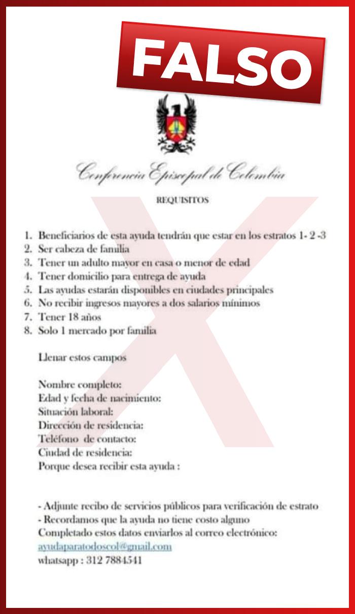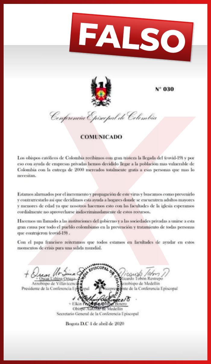 Si bien la Iglesia Católica en el país ha desplegado una estrategia de ayuda y acompañamiento a las poblaciones vulnerables, el comunicado en mención es FALSO.