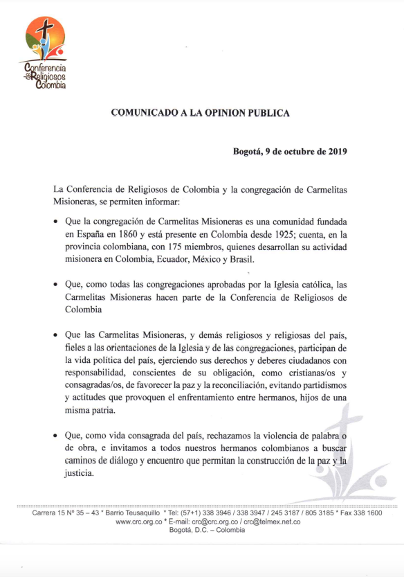 La Conferencia de Religiosos de Colombia (CRC) ha emitido un comunicado informando sobre la comunidad de las Carmelitas Misioneras en este país.