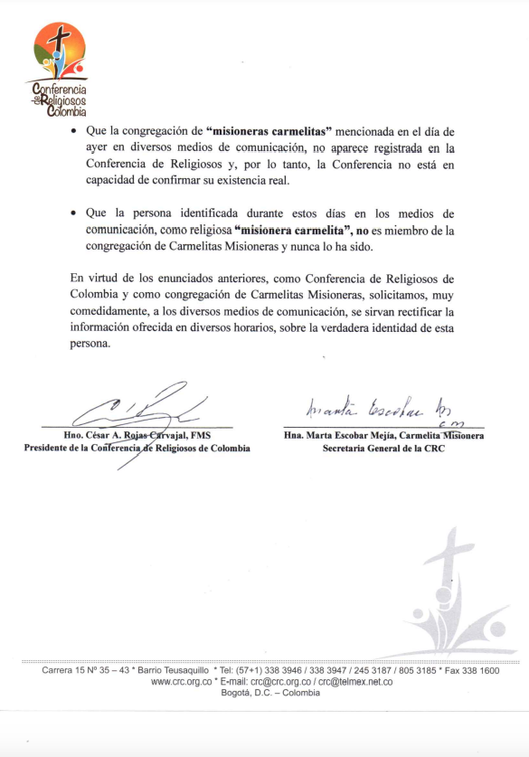En el mismo comunicado se aclara que "la persona identificada durante estos días en los medios de comunicación como "misionera carmelita", no es miembro de la Congregación de Carmelitas Misioneras y nunca lo ha sido".