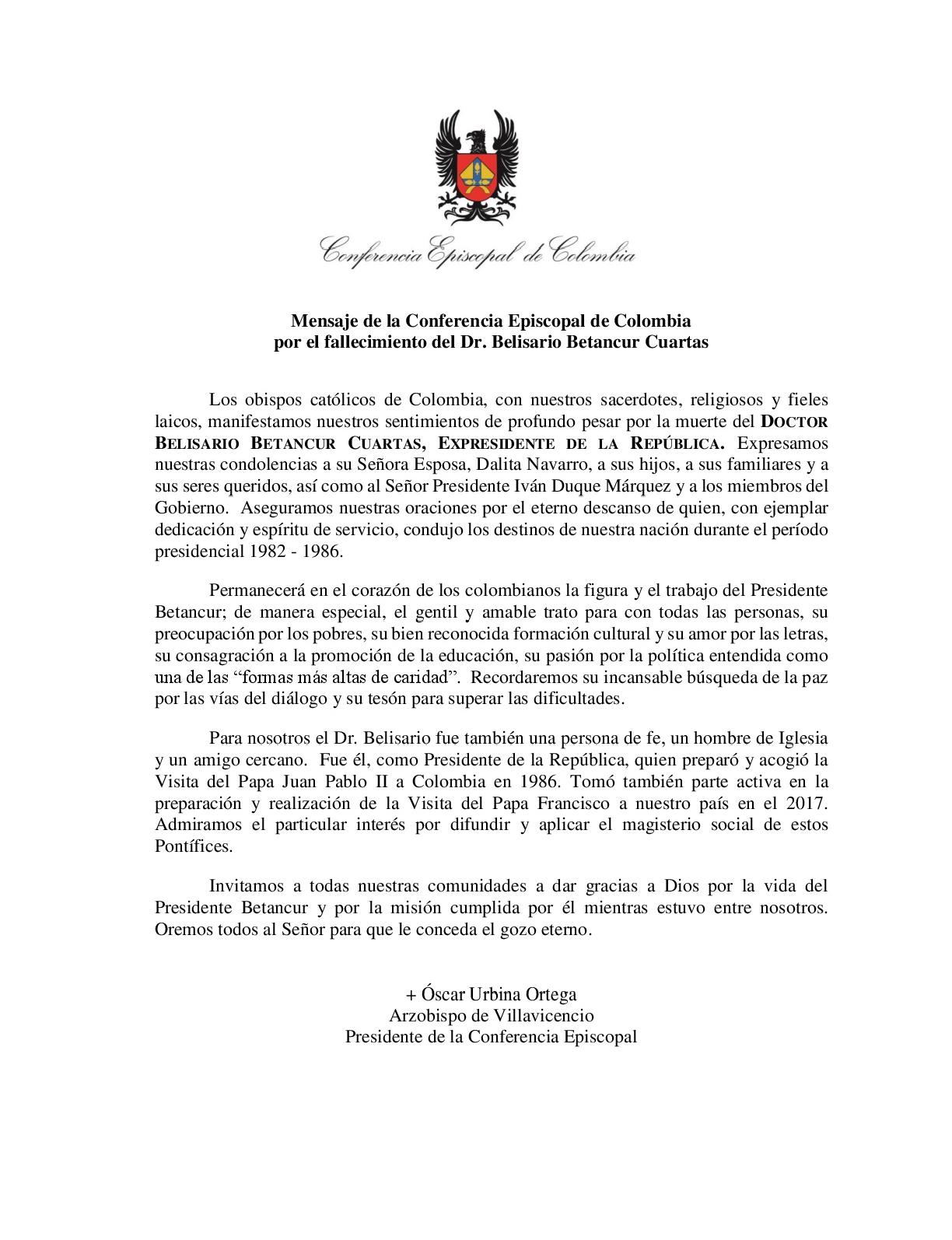 A través de un mensaje, la Conferencia Episcopal de Colombia expresa su pesar por el fallecimiento del doctor Belisario Betancur Cuartas, Expresidente de la República. …