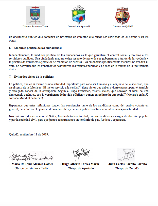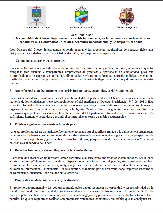 Iglesia en Chocó pide a candidatos transparencia y programas integrales