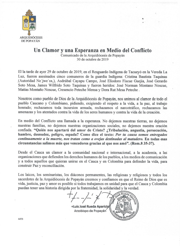 En un comunicado, publicado el 30 de octubre, un día después del asesinato de Cristina Bautista, autoridad de la comunidad Nasa, y de los guardias José Gerardo Soto, James Wilfredo Soto, Eliodoro Uniscue y Asdruval Cayapu, la Iglesia presente en la zona ratificó el rechazo a “toda incursión armada, al narcotráfico, a las amenazas y atentados contra la vida de los seres humanos y contra la creación”.