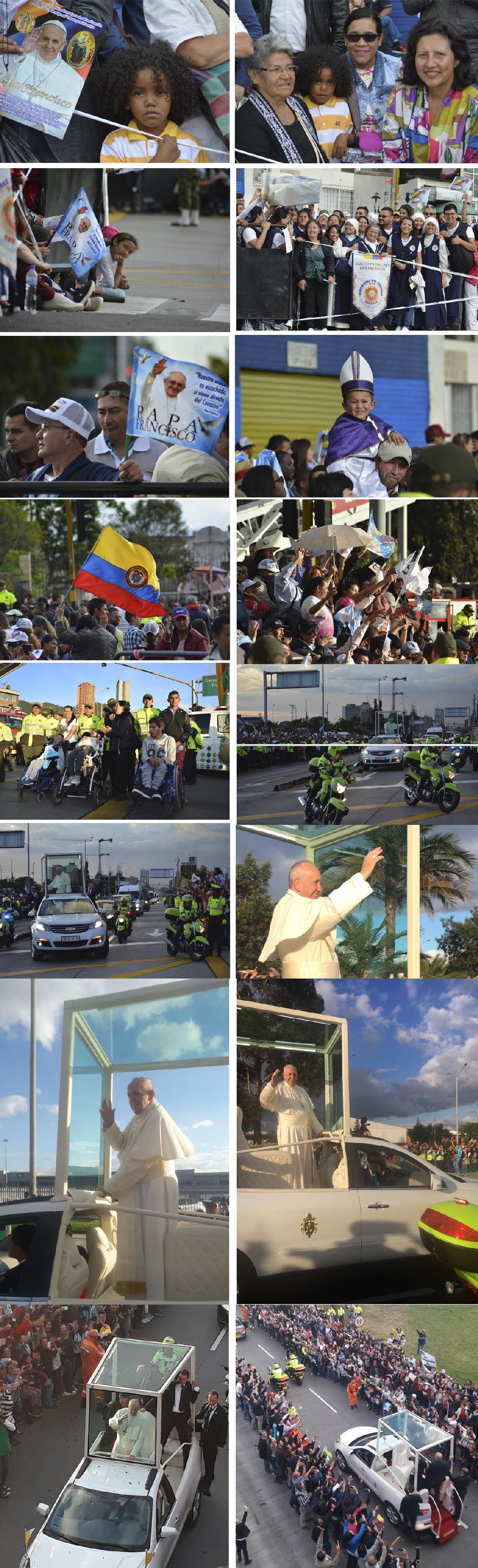 La multitud al lado y lado dela calle 26 parecía una alfombra, todos los fieles querían captar con sus teléfonos y cámaras una postal del Santo Padre. En sus primeras declaraciones invitó a todos los colombianos a no perder la esperanza ni la alegría.