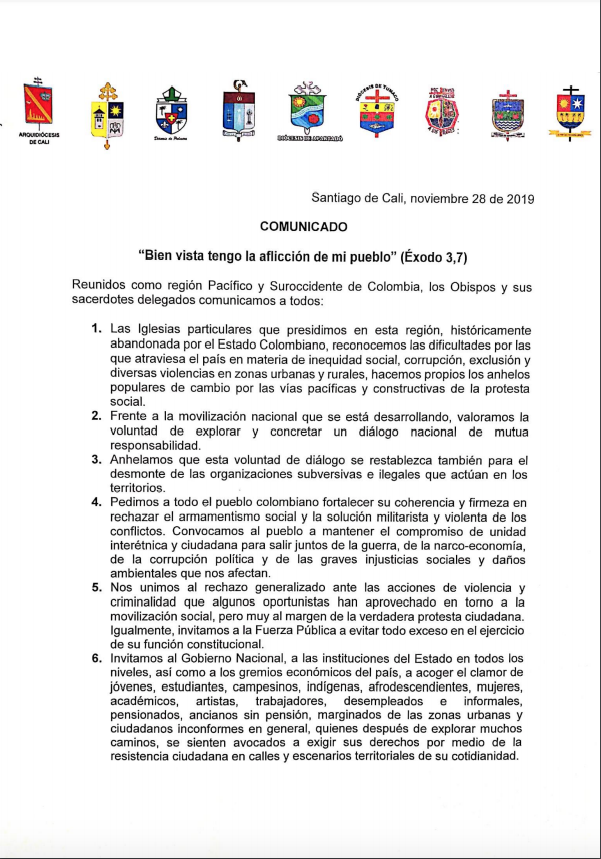 Así mismo, exhortan al Gobierno Nacional, a las instituciones del Estado en todos los niveles, así como a los gremios económicos del país, para que acojan el “clamor de todos los ciudadanos que se sienten avocados a exigir sus derechos por medio de la resistencia ciudadana en calles y escenarios territoriales de su cotidianidad”.