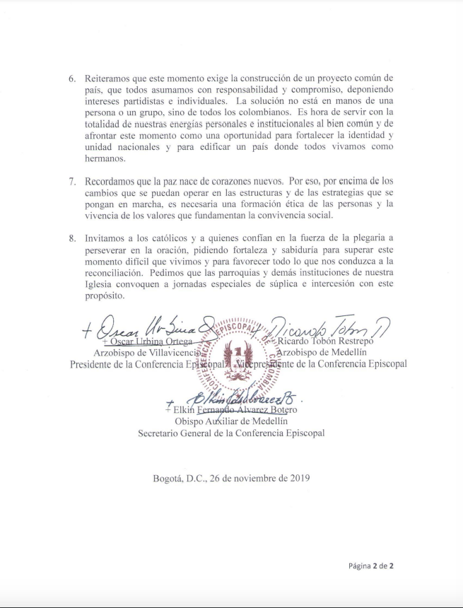 Ante los hechos que está viviendo el país, los obispos de la Iglesia católica en Colombia, han emitido, este 26 de noviembre, un comunicado con ocho puntos en el que…