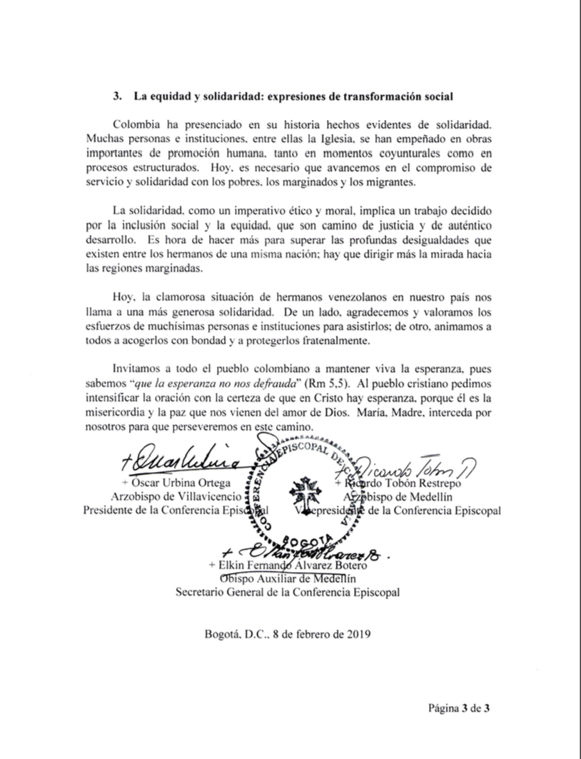 “Hoy, la clamorosa situación de hermanos venezolanos en nuestro país nos llama a una más generosa solidaridad. De un lado, agradecemos y valoramos los esfuerzos de muchísimas personas e instituciones para asistirlos; de otro, animamos a todos a acogerlos con bondad y a protegerlos fratenalmente”.