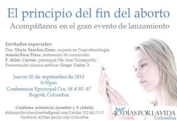 El lanzamiento de esta campaña fue el jueves 10 de Septiembre, a las 7:00 pm en el auditorio Regina Apostolorum de la Conferencia Episcopal de Colombia. Intervendrán en el evento, la Doctora Gloria Sánchez Zinny (Bs.As, Argentina), Médica Ginecóloga, Especialista en Endocrinología de la Reproducción; Método Creighton y Naprotecnología (Tecnología de procreación natural), el Padre Alirio Cuevas (Párroco Iglesia Santa Ana, Teusaquillo), la reconocida Amada Rosa Pérez y el equipo de “40 días por la vida Colombia”. Además se contará con el acompañamiento musical de la agrupación católica “Unión3”